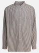 "Lisa Oxford SN" Beams Plus shirt made of yarn-dyed striped Oxford fabric. The construction features an oversize silhouette with a button-down collar and patch pocket on the chest. The hem is curved, and the cuffs are closed with buttons. The back features a box pleat and an integrated hanging loop at the top of the back. No additional ornamental elements.